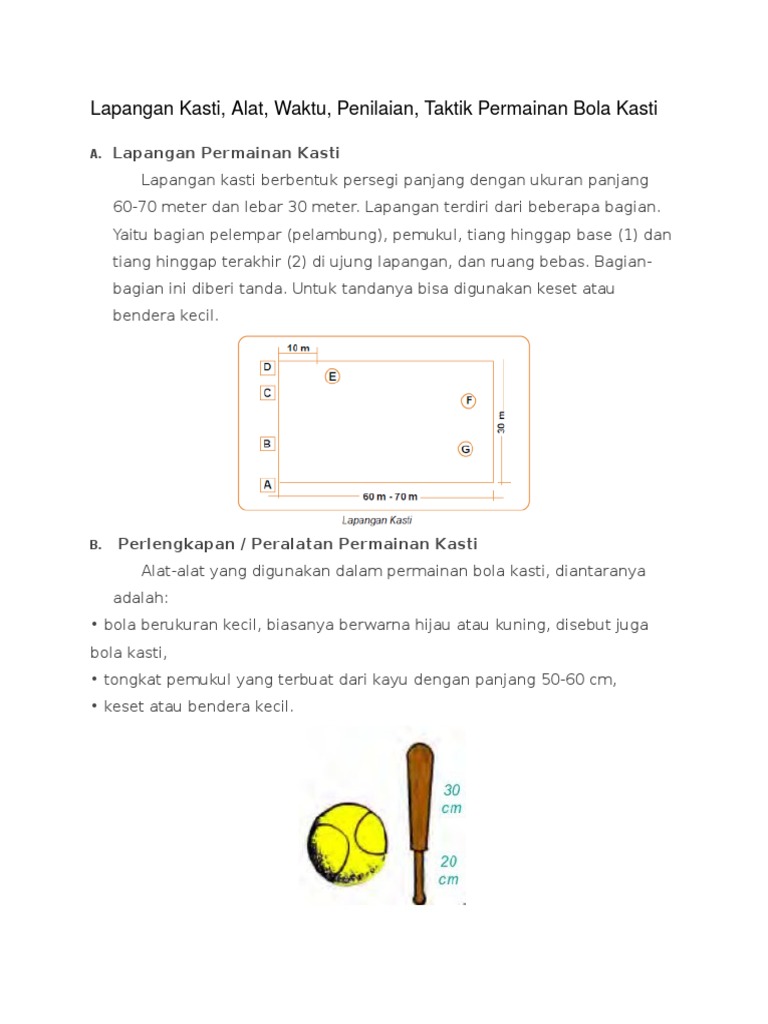 Untuk ukuran lapangan kasti sendiri yang asli memiliki ukuran lebar 70 meter, ukuran panjang 40 meter, serta 10 meter untuk bagian ruang tunggunya. Ukuran lapangan kasti, ukuran bola kasti, ukuran pemukul kasti. Permainan rounders seperti halnya kasti, bola bakar dan keppers adalah termasuk permainan bola kecil yang sangat menarik untuk dimainkan bagi anak. Lapangan kasti berbentuk persegi panjang dengan ukuran 30×60 meter. Lapangan baseball memiliki bentuk persegi panjang yang biasanya dimainkan di area yang luas. Lapangan bola kasti berbentuk empat persegi panjang. Regu yang paling banyak mengumpulkan nilai, merekalah yang keluar sebagai pemenang. Peralatan digunakan untuk mempermudah permainan. Jual bola tenis lapangan atau kasti merk wilson, dunlop, head atp lainnya juga bola tenis bertali kasti untuk latihan tenis daftar harga bola tenis lengkap di pilih bola tenis dengan permukaan bola yang sudah sesuai dengan jenis lapangan. Secara garis besar lapangan kasti dibedakan menjadi 5 tempat, meliputi tempat pemain, tempat pelambung, tempat pemukul, tempat belakang, tempat regu penjaga, dan tempat hinggap. 5 m dari panjang lapangan l. 2.lapangan permainan bola kasti berbentuk? Bola tangkap setiap bola yang terpukul dan dapat ditangkap oleh pemain lapangan sebelum mengenai tanah, dinyatakan sebagai bola tangkap.